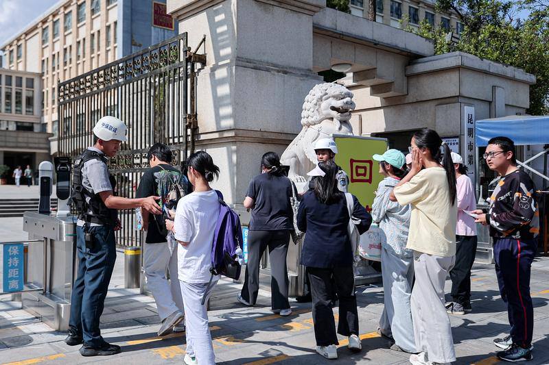 高考考生们进入昆明市第一中学考点,前往考场“踩点”。