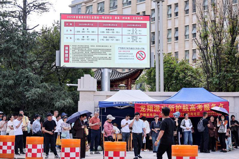 昆明市第一中学考点外,电子大屏滚动播放考场分布示意图及高考相关注意事项。