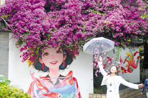 翠湖畔中和巷28号的“锦鲤女孩”壁画火上热搜,簪花少女花墙成了游客拍照打卡的绝佳地点。花墙以沿墙栽种的三角梅为背景,描绘了一组俏皮可爱的美少女头像,一簇簇紫红色的花瀑倾泻而下,与画中捧着锦鲤的少女相遇,形成“画中花、花中画”的虚实交融效果。