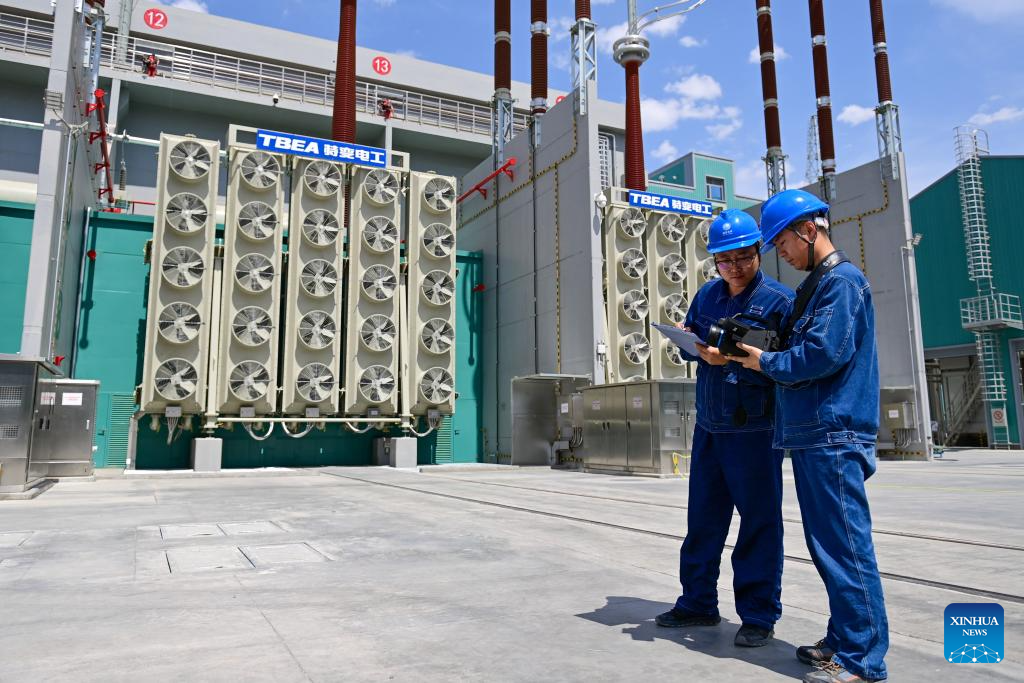 Staff members check equipment at the Barkol converter station, the sending end of the Hami-Chongqing ±800 kV ultra-high voltage direct current transmission project, in Hami, northwest China's Xinjiang Uygur Autonomous Region, June 10, 2025. The State Grid Corporation of China on Tuesday announced the operation of the ±800 kV ultra-high voltage direct current transmission project linking eastern Xinjiang's Hami with southwest China's Chongqing Municipality.