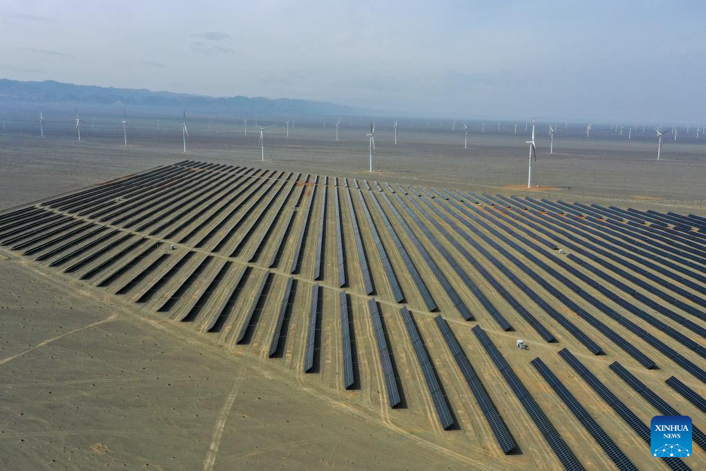 An aerial drone photo shows a photovoltaic and wind farm as part of the Hami-Chongqing ±800 kV ultra-high voltage direct current transmission project, in Hami, northwest China's Xinjiang Uygur Autonomous Region, March 23, 2025. The State Grid Corporation of China on Tuesday announced the operation of the ±800 kV ultra-high voltage direct current transmission project linking eastern Xinjiang's Hami with southwest China's Chongqing Municipality.