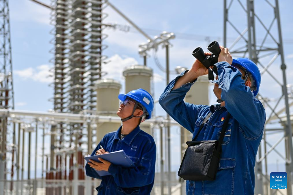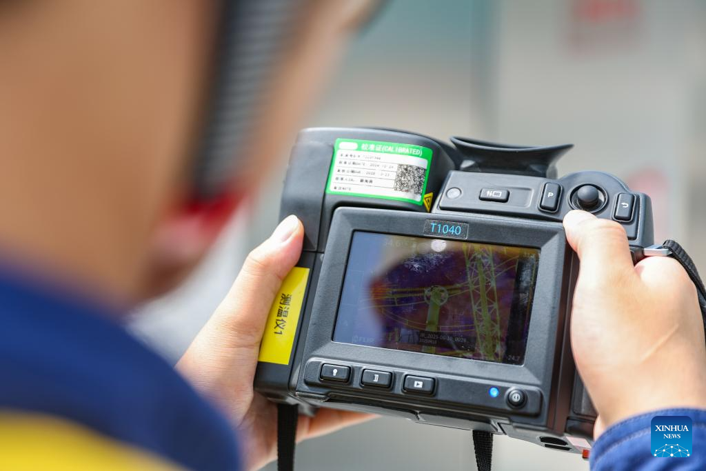Staff members conduct an infrared detection at the Barkol converter station, the sending end of the Hami-Chongqing ±800 kV ultra-high voltage direct current transmission project, in Hami, northwest China's Xinjiang Uygur Autonomous Region, June 10, 2025. The State Grid Corporation of China on Tuesday announced the operation of the ±800 kV ultra-high voltage direct current transmission project linking eastern Xinjiang's Hami with southwest China's Chongqing Municipality.