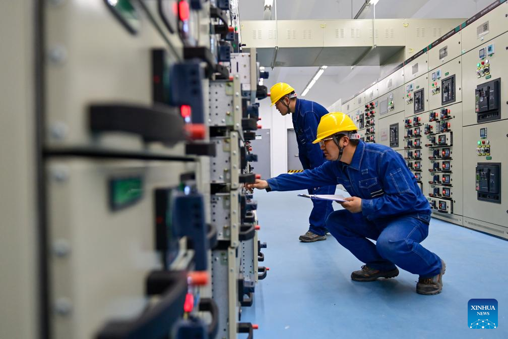 Staff members check a power distribution room at the Barkol converter station of the Hami-Chongqing ±800 kV ultra-high voltage direct current transmission project, in Hami, northwest China's Xinjiang Uygur Autonomous Region, June 10, 2025. The State Grid Corporation of China on Tuesday announced the operation of the ±800 kV ultra-high voltage direct current transmission project linking eastern Xinjiang's Hami with southwest China's Chongqing Municipality.