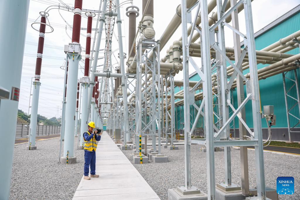 A maintenance worker performs infrared temperature measurement on operational lines at the Yubei converter station of the Hami-Chongqing ±800 kV ultra-high voltage direct current transmission project, in southwest China's Chongqing Municipality, June 10, 2025. The State Grid Corporation of China on Tuesday announced the operation of the ±800 kV ultra-high voltage direct current transmission project linking eastern Xinjiang's Hami with southwest China's Chongqing Municipality.
