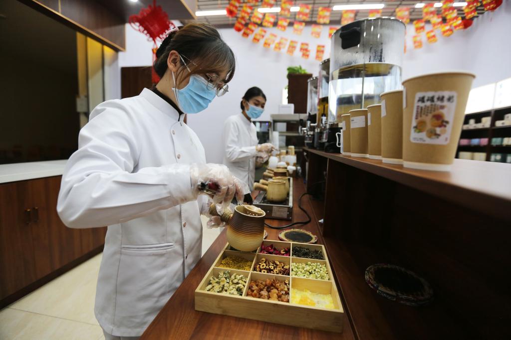 2024年12月24日,在甘肃省定西市中医医院,工作人员在配制中药茶饮。新华社发(王克贤摄)
