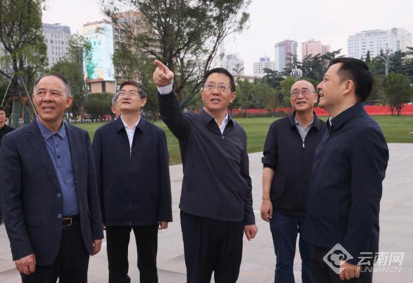 王予波在昆明市东风广场察看恢复工程效果及周边环境风貌。记者 顾彬 摄