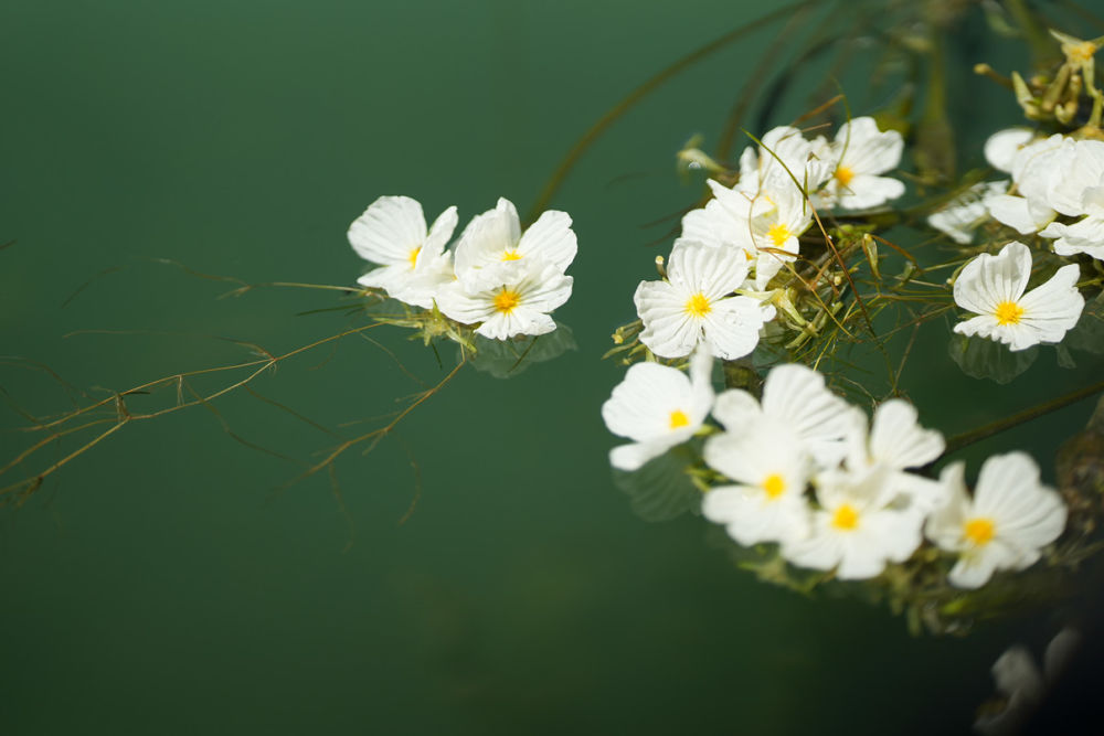 盛放的波叶海菜花,花瓣洁白如雪,中心点缀金黄,漂浮于碧绿湖水之上。(丽江融媒记者 李扬 摄)