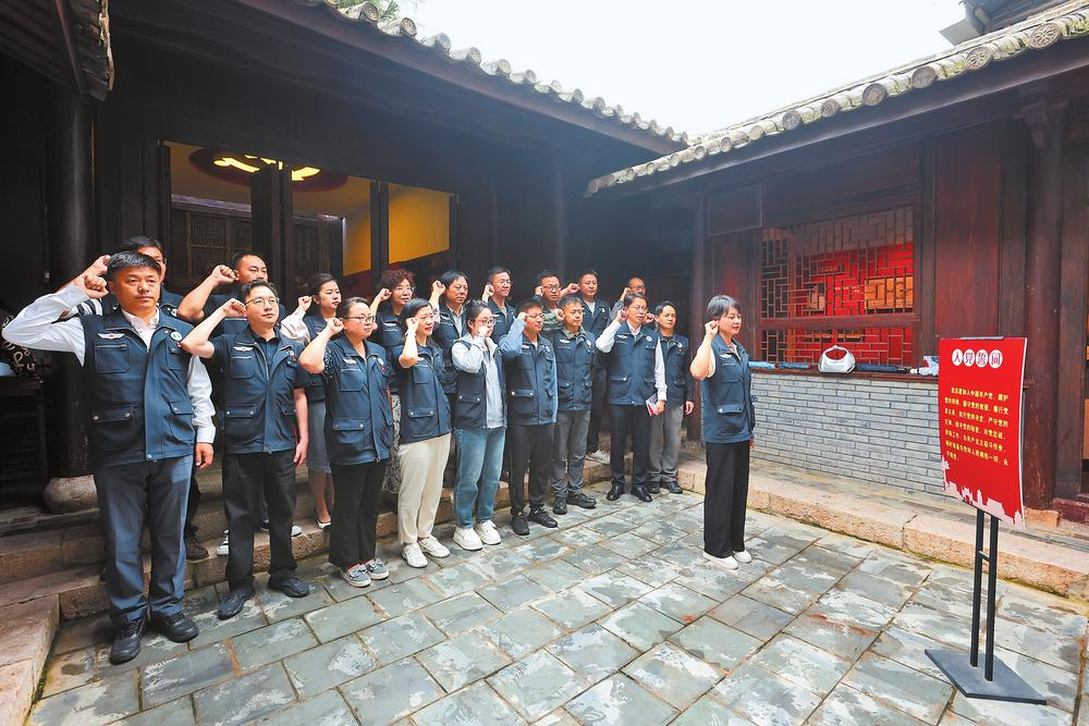 7月1日,在昆明市平政街节孝巷39号中共云南地下党建党旧址,应急管理部南方航空护林总站的党员重温入党誓词。 记者 陈飞 摄