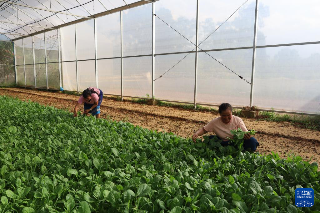 5月29日,在老挝首都万象城郊,金花村村民在大棚里摘菜。新华社记者 马淮钊 摄