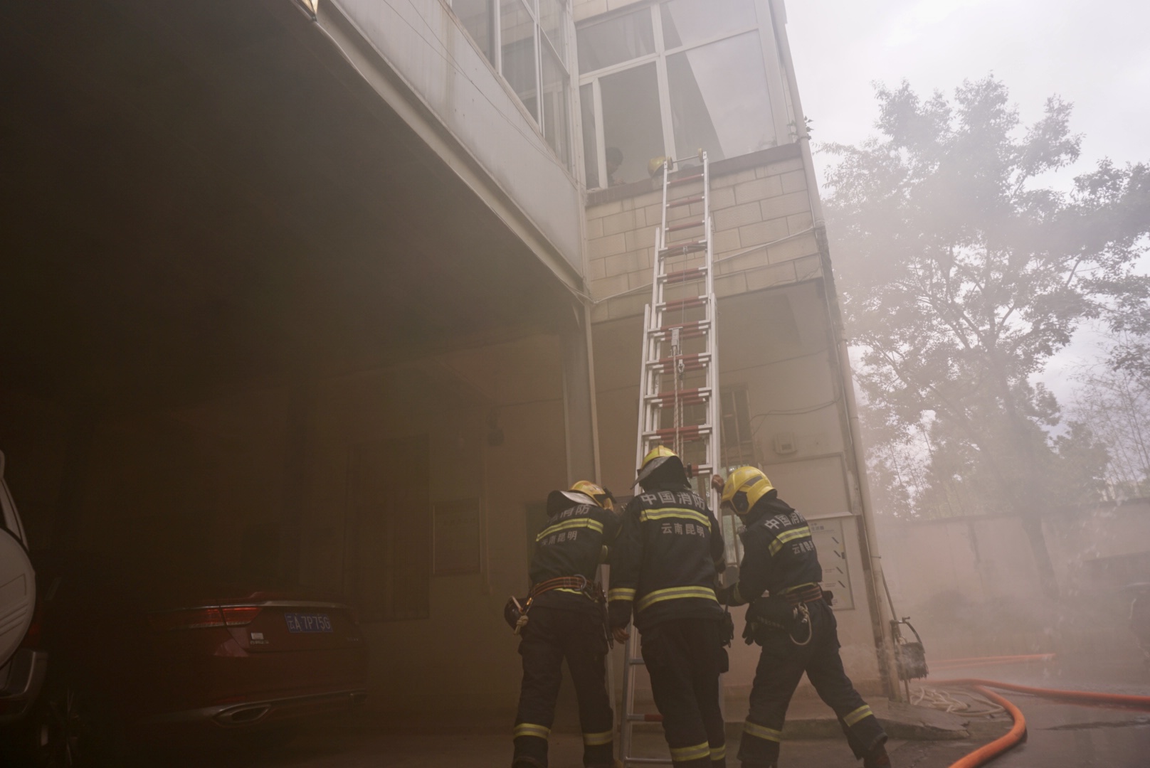 为了让参训人员更深刻地感受到火灾发生过程中烟气带来的危害,以及火场被困救援过程,理论培训结束后,还进行了电动自行车燃烧实验和火场逃生演练。当电动自行车燃烧以后,浓烈刺鼻的烟味让现场人员纷纷捂住口鼻。逃生演练环节,模拟和平社区办公楼1楼着火,2楼有人员被困。消防员接警后迅速到达现场展开救援,随后,外围压制控火、沿楼层铺设水带内攻、爬梯疏散救援等科目逐一展开,让在场人员充分了解了消防救援的全过程,体验了“火场”等待救援的紧张时刻,让抽象的消防知识变得可感可触、可学可用。
