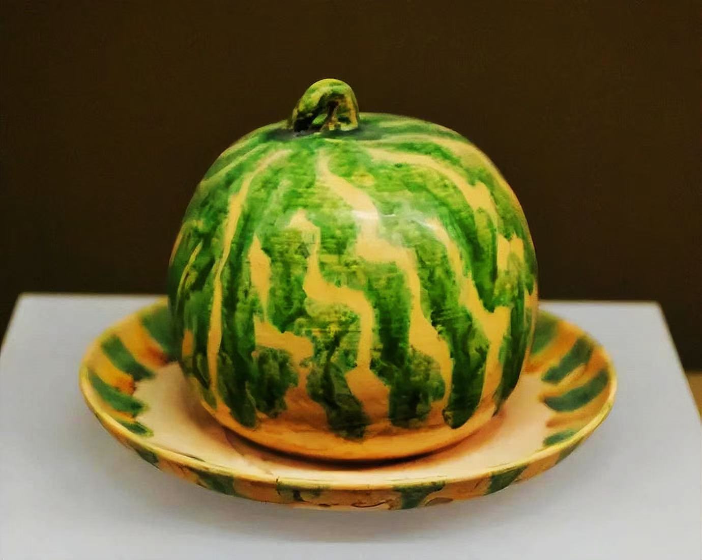 唐代虽然没有发现和西瓜有关的文字记载,但留下了一件唐三彩西瓜,这件文物现藏于陕西历史博物馆。西瓜高13.5厘米,直径为14厘米,整个西瓜呈圆形,上端略小,立在一个敞口浅腹的盘内,瓜与盘连体。绿釉绘制的瓜皮纹路逼真、自然,西瓜顶端还有一截弯曲的瓜蔓,瓜蒂为环钮状,做工精美,几乎能以假乱真。看着这圆滚滚的绿皮西瓜,不禁口齿生津,就有一种剖开分而食之的欲望,正可谓:“下咽顿消烟火气,入齿便作冰雪声。”