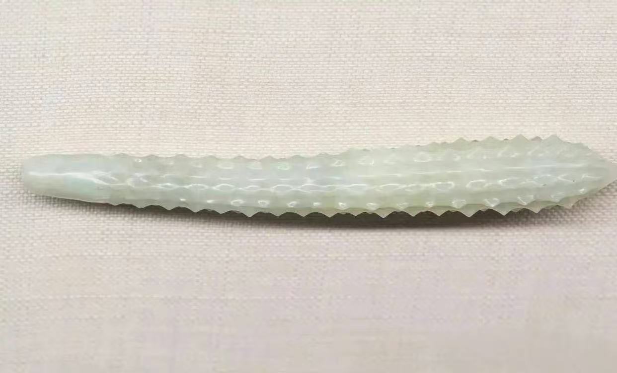 清代晚期的玉雕黄瓜摆件,现藏于湖南湘潭市博物馆。这件玉黄瓜足足有26厘米长,它质地温润得像刚从清泉里捞出来似的,每一处脉络、每一根小刺都被雕刻得栩栩如生,仿佛是一根真正的黄瓜,可谓巧夺天工。这种精湛的工艺让人叹为观止,展现了清代玉雕工艺的高超水平。从玉黄瓜的表面可以看到,玉雕师巧妙地利用了玉石的天然纹理,使其与黄瓜的脉络相得益彰,进一步增强了作品的真实感和艺术感,充满了浓厚的生活气息。