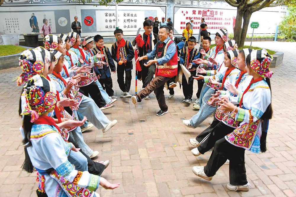 郭建荣在巍山青云小学教孩子们彝族打歌。通讯员陆向荣 摄