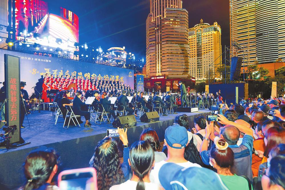 同时,第八届聂耳音乐周昆明分会场闭幕式在东风广场举行。由昆明聂耳交响乐团、澳门管弦乐团等230余人组成强大阵容团队,联袂演绎气势磅礴的《长征组歌》等经典作品,传承爱国精神,奏响时代强音。(云南日报 记者杨茜 王剑钊)