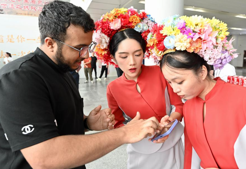 Staff members assist foreigners in using the local apps at Quanzhou Jinjiang International Airport in Quanzhou, east China's Fujian Province, on June 20, 2025. (Xinhua/Jiang Kehong)