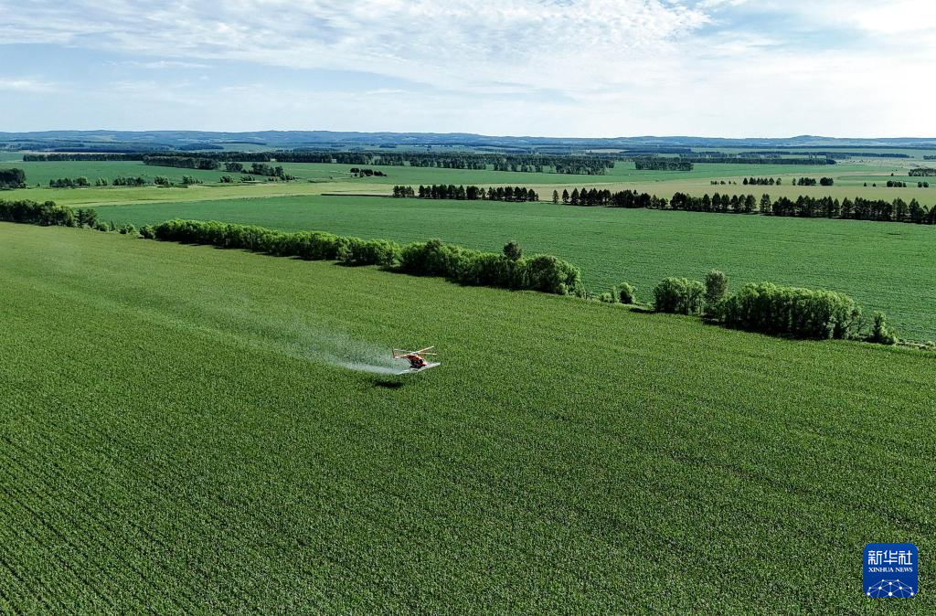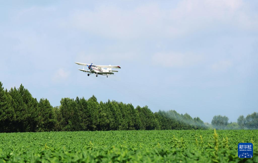 7月25日,在北大荒集团黑龙江红星农场第一管理区大豆地块,一架农用飞机在进行航化作业。新华社发(侯越摄)