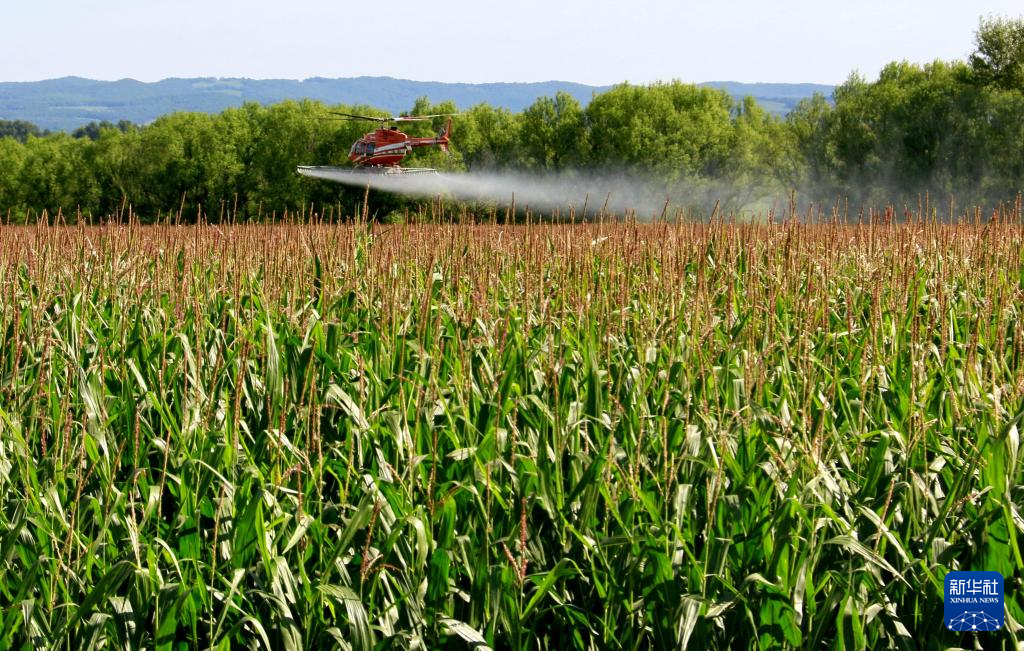 7月27日,在北大荒集团黑龙江尾山农场有限公司玉米地块,农用直升机在进行航化作业。新华社发(陆文祥摄)