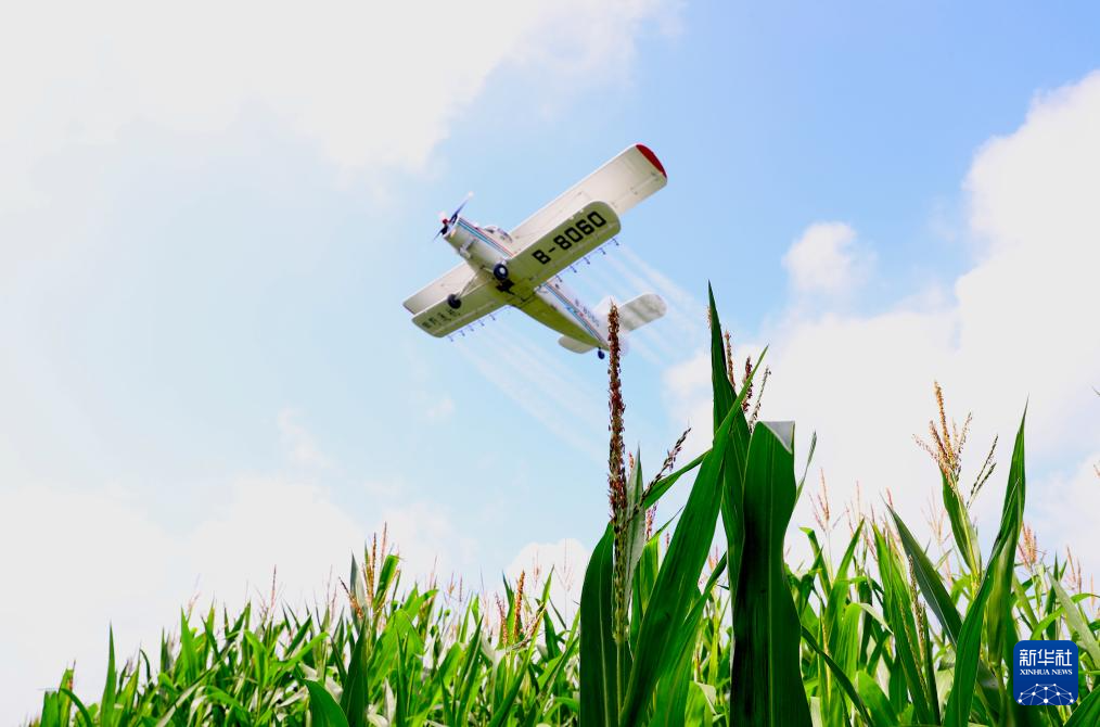 7月25日,在北大荒集团北安分公司赵光农场有限公司第五管理区玉米地号,一架农用飞机在进行航化作业。新华社发(钱泊羽摄)