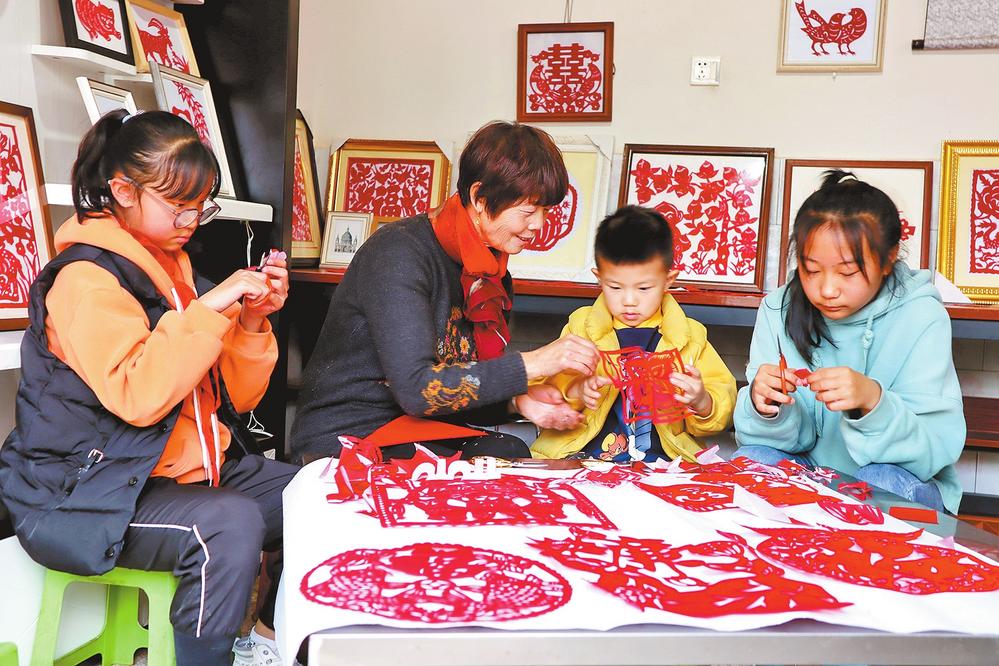 禄丰市剪纸非物质文化遗产代表性传承人在指导孩子们剪制莲花图案,以“莲”喻“廉”,播撒廉洁种子。云南日报通讯员胡晓霞/摄