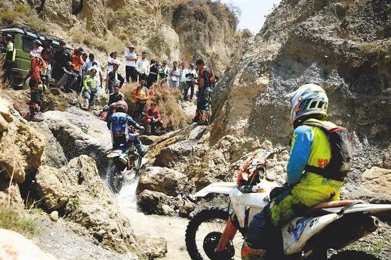 “金布多”摩托车越野赛15.6公里的赛道集断崖、溪流、巨石于一体,被赛事主办方汇和体育负责人李红伟誉为“国内罕见的全地形挑战赛道”。202名车手在引擎的轰鸣声中展开激烈角逐,疾驰的车影与自然风光相映成趣,上演了一场精彩的“画中竞速”。