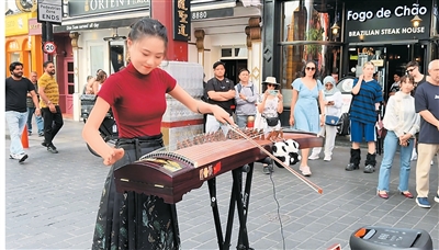 在表演过程中,有不少游客对王加琦手里的乐器产生好奇。她说:“很多人之前对中国乐器不了解。后来,我制作了介绍古筝的资料,放在现场,方便大家知道得更全面。我的古筝上还挂着一个熊猫玩偶,不少人看到之后,一下就知道,我来自中国,这是中国的乐器。”