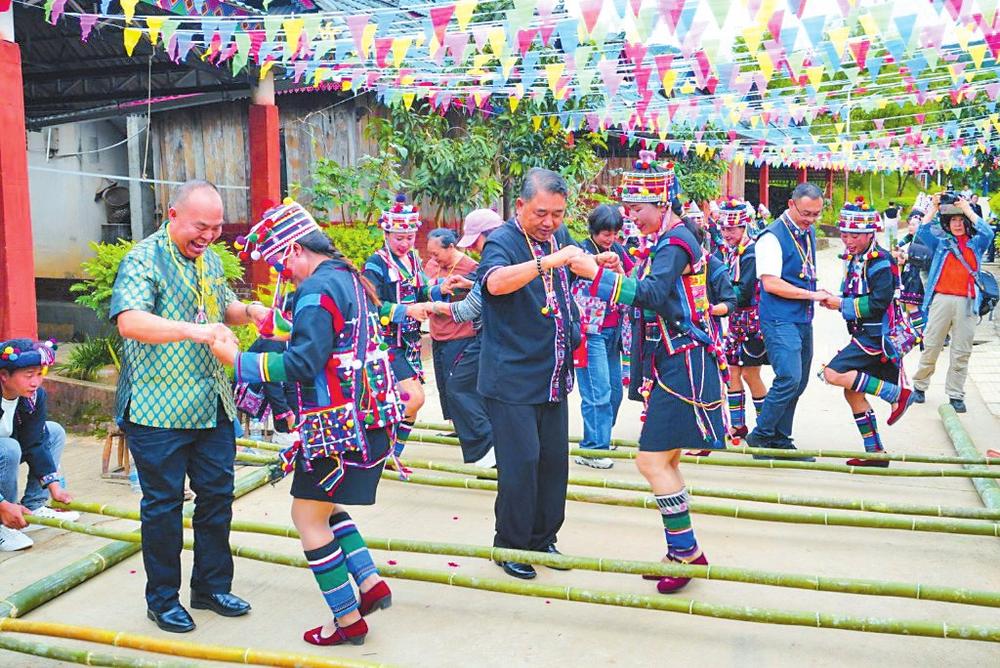 共跳竹竿舞。