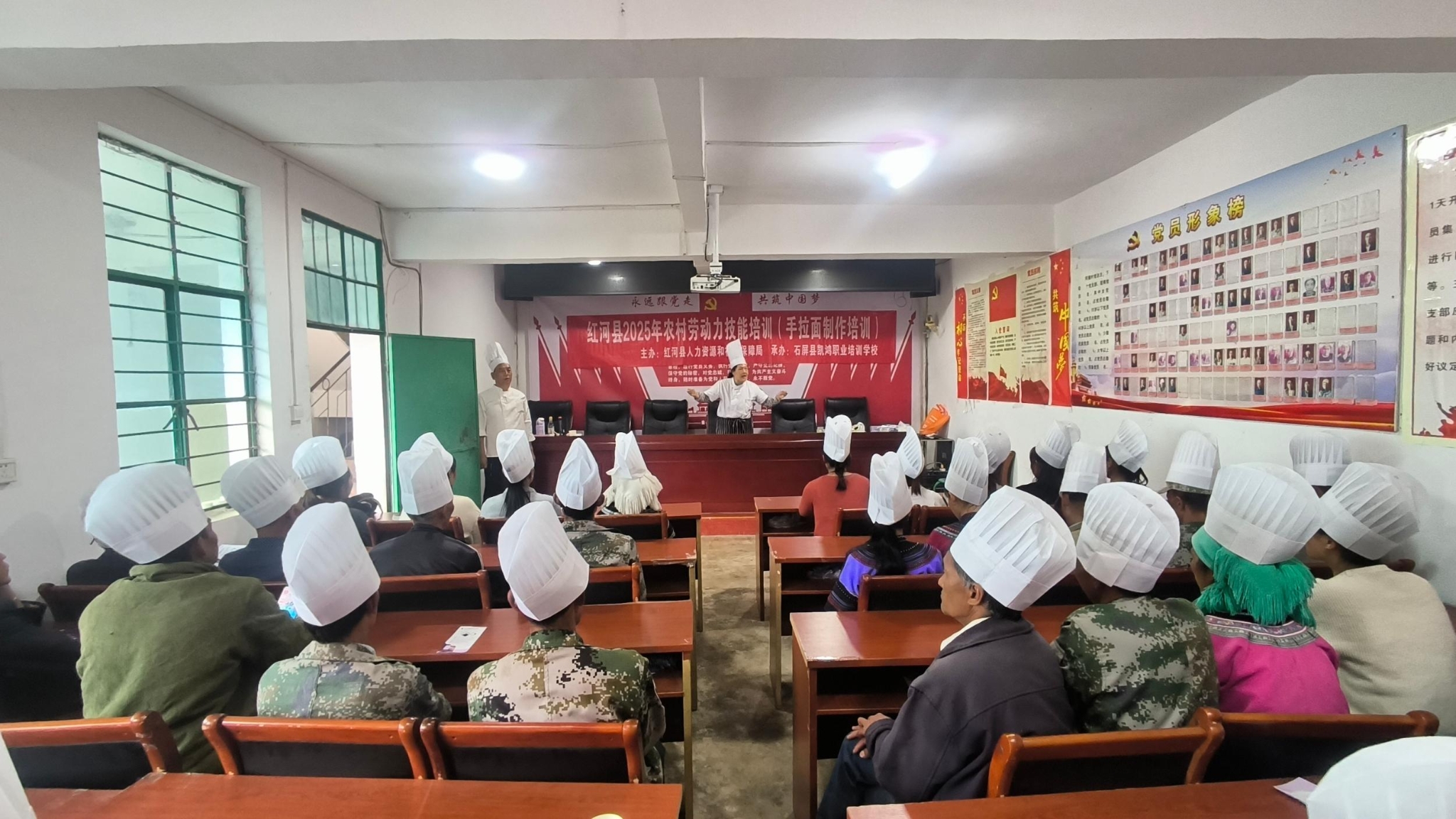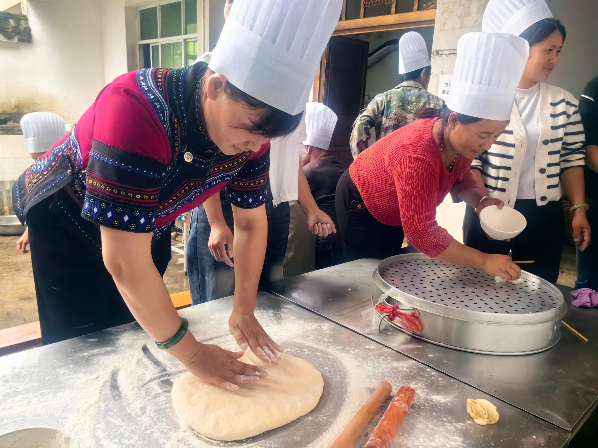 “清水要分次倒进面盆,边倒边用筷子搅成絮状……”日前,在红河哈尼族彝族自治州红河县甲寅镇阿撒村委会开展的手拉面制作培训班里,60名少数民族群众正围在矮桌拼成的案板旁,在讲师和本村班主任的辅导下,学习馒头、烩面、花式面点的制作流程。手把手的教授不仅让本地村民迅速掌握了技艺,更点燃了不少人的创业热情。