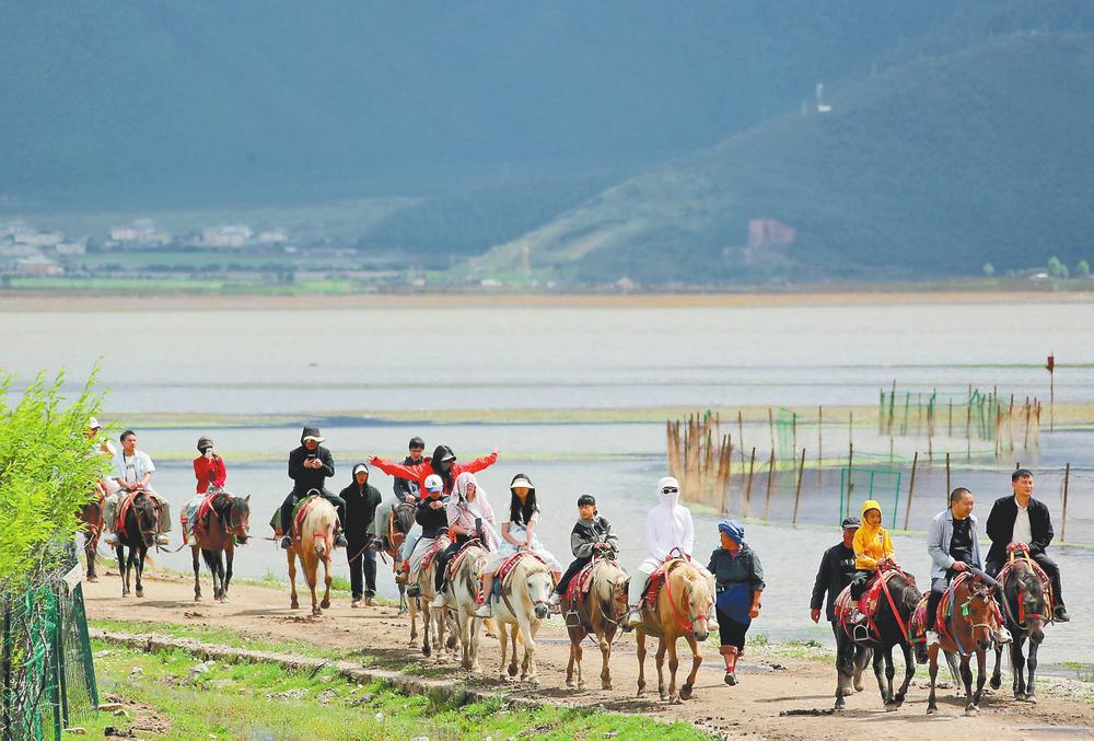 图为游客在纳帕海景区骑马游玩。