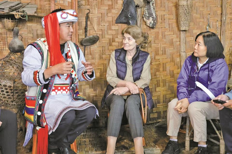 郁伍林(左一)在民宿内接待外国游客 受访者 供图