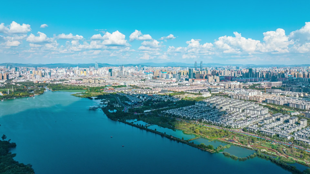 初秋时节,航拍镜头下的昆明尽展高原明珠的独特魅力。碧空澄澈,白云舒卷,滇池如镜,与城市天际线相映成辉。
