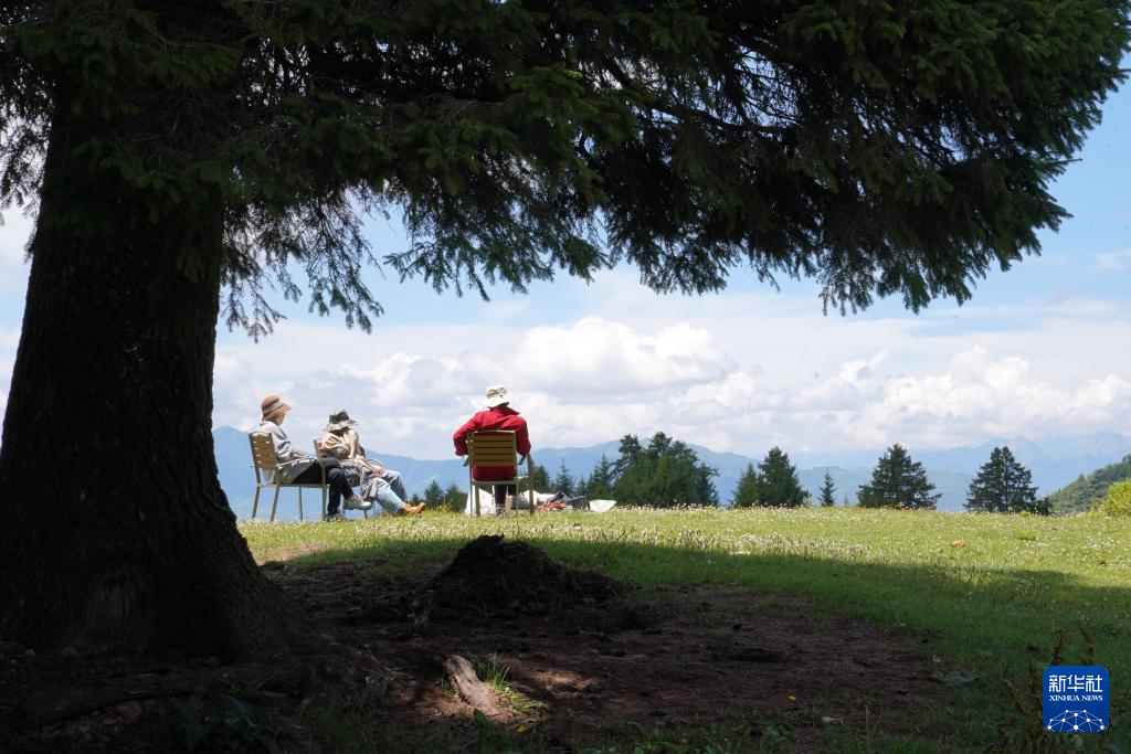 几位游客在舟曲拉尕山上露营游玩(7月12日摄)。