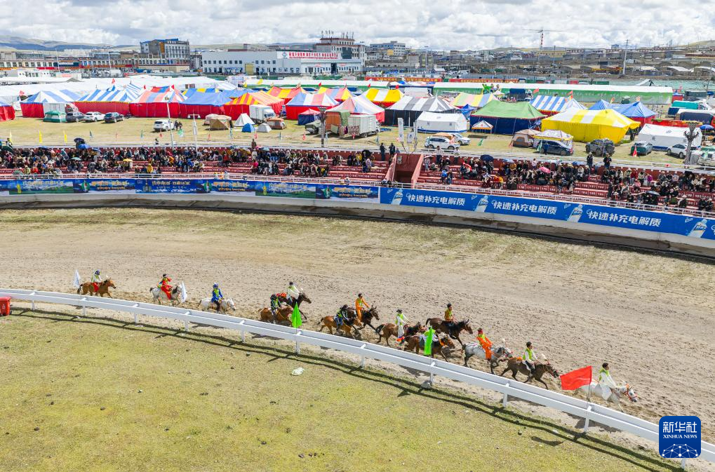 这是9月6日拍摄的恰青赛马节比赛现场(无人机照片)。(新华社 记者丁增尼达 摄)