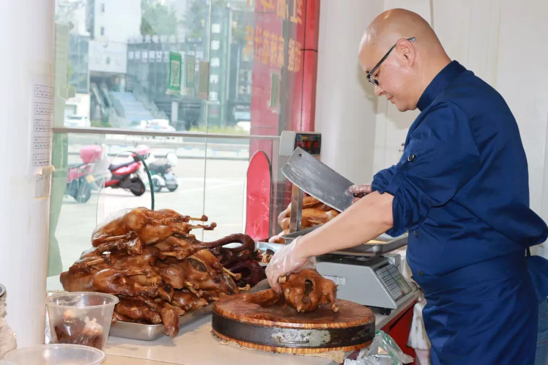 其核心技艺在于精选三十余种天然香料调配卤水,并坚持使用老卤养护,秉承“武火煮沸、文火慢煨”的古法技艺,使卤汁充分渗透,造就了卤鹅“三黄一白”(鹅皮金黄、鹅蹼橙黄、卤油亮黄、肉质雪白)的独特品质和咸鲜微辣的经典口感。始终坚持纯手工古法卤制,确保了卤鹅的原汁原味和健康品质。