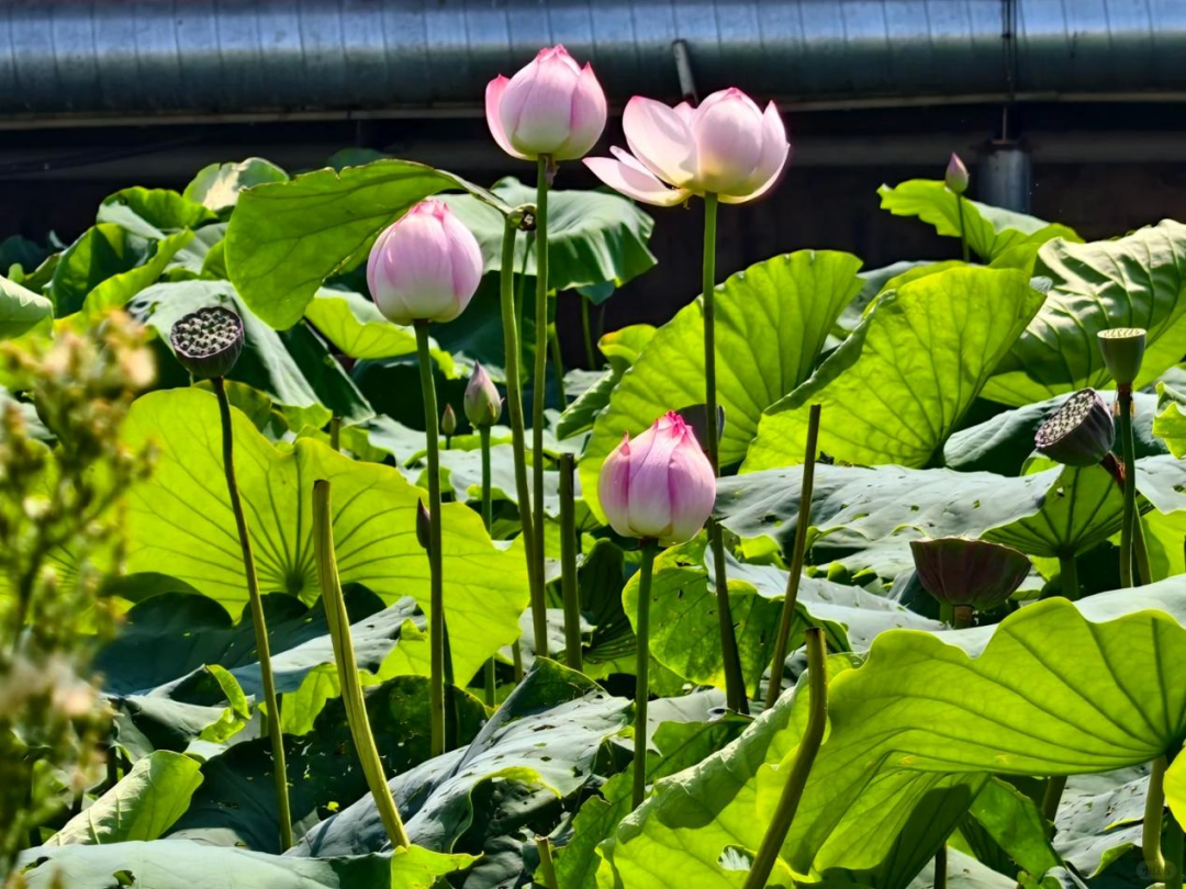 每到深秋,叶子染成了铁锈般的红色,与岸边的银杏、枫香共绘出了一幅三色秋图。而夏日则属于“荷风廊”,六至八月间,荷花亭亭,开得如烟如霞。风一来,花瓣轻颤,露珠自叶面滑落,惊起一池小鱼。