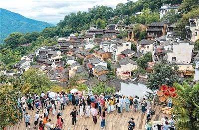 江西省婺源县篁岭村“晒秋”美景,吸引众多游客前来游览。