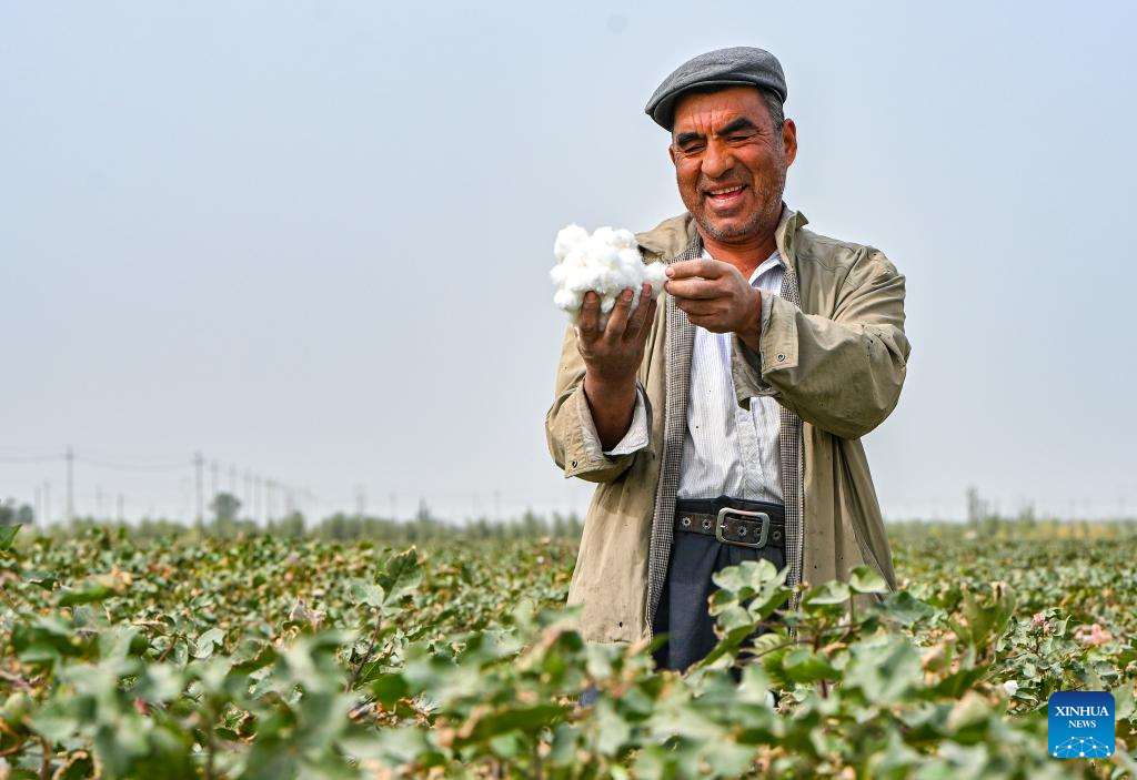 This photo shows cotton grown in Daxi Village of Yuli County, Mongolian Autonomous Prefecture of Bayingolin, northwest China's Xinjiang Uygur Autonomous Region, Sept. 19, 2025. People in Daxi Village of Yuli County used to live a poor life due to the harsh natural environment and limited means of living. In recent years, local authorities have made efforts to develop tourism and e-commerce to promote rural development, which has brought more income for local villagers. (Xinhua/Chen Shuo)
