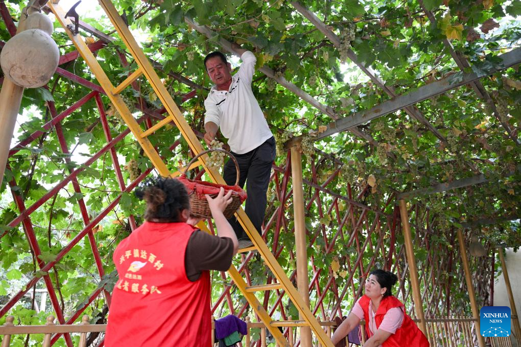 Village cadres help a villager pick grapes in Daxi Village of Yuli County, Mongolian Autonomous Prefecture of Bayingolin, northwest China's Xinjiang Uygur Autonomous Region, Sept. 18, 2025. People in Daxi Village of Yuli County used to live a poor life due to the harsh natural environment and limited means of living. In recent years, local authorities have made efforts to develop tourism and e-commerce to promote rural development, which has brought more income for local villagers. (Xinhua/Xin Yuewei)