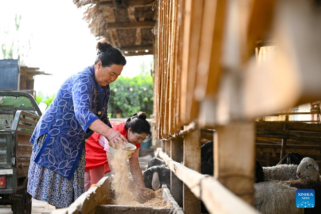 A village cadre (back) helps a local villager to feed sheep in Daxi Village of Yuli County, Mongolian Autonomous Prefecture of Bayingolin, northwest China's Xinjiang Uygur Autonomous Region, Sept. 18, 2025. People in Daxi Village of Yuli County used to live a poor life due to the harsh natural environment and limited means of living. In recent years, local authorities have made efforts to develop tourism and e-commerce to promote rural development, which has brought more income for local villagers. (Xinhua/Xin Yuewei)