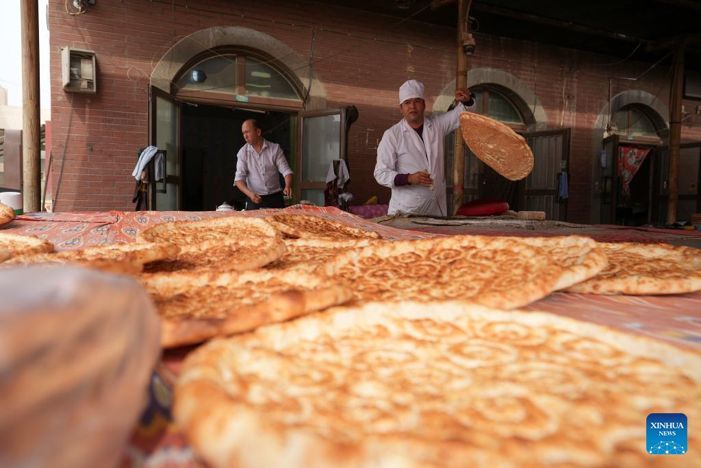A villager (R) makes naan bread, a kind of crusty pancake, in Daxi Village of Yuli County, Mongolian Autonomous Prefecture of Bayingolin, northwest China's Xinjiang Uygur Autonomous Region, Sept. 19, 2025. People in Daxi Village of Yuli County used to live a poor life due to the harsh natural environment and limited means of living. In recent years, local authorities have made efforts to develop tourism and e-commerce to promote rural development, which has brought more income for local villagers. (Xinhua/Jiang Wenyao)