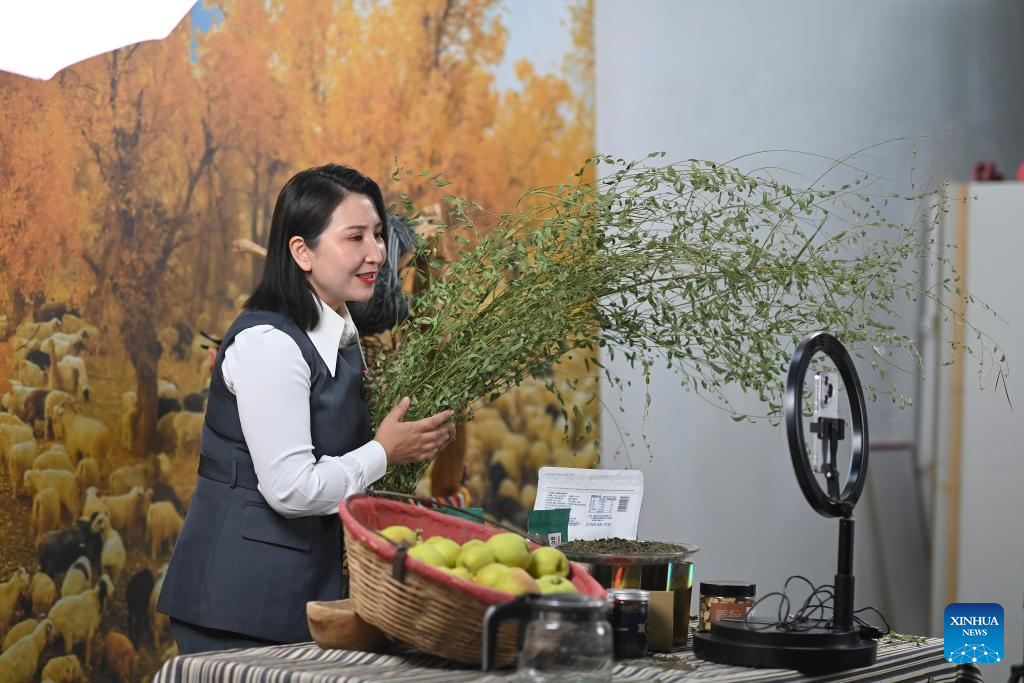 A villager promotes local agricultural products via live streaming at an e-commerce base in Daxi Village of Yuli County, Mongolian Autonomous Prefecture of Bayingolin, northwest China's Xinjiang Uygur Autonomous Region, Sept. 19, 2025. People in Daxi Village of Yuli County used to live a poor life due to the harsh natural environment and limited means of living. In recent years, local authorities have made efforts to develop tourism and e-commerce to promote rural development, which has brought more income for local villagers. (Xinhua/Lu Ye)