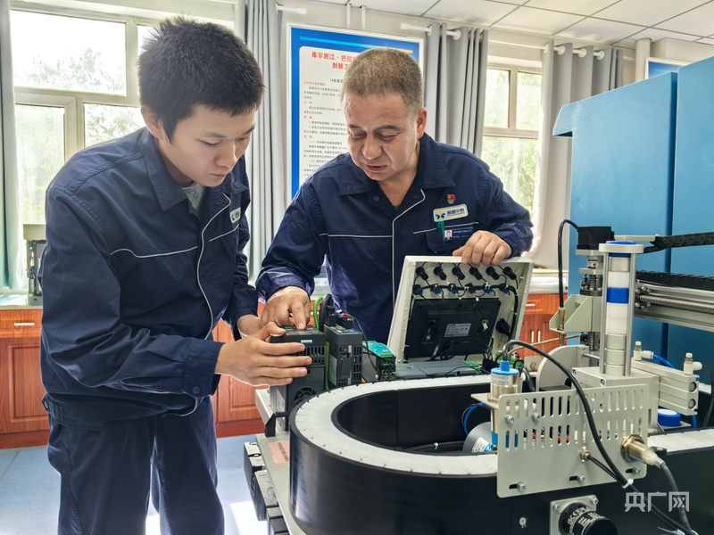 走进位于新疆乌鲁木齐市米东区的新疆华泰重化工有限责任公司库尔班江·巴拉提维修电工技能大师创新工作室,今年46岁的库尔班江·巴拉提正在带着徒弟做试验。