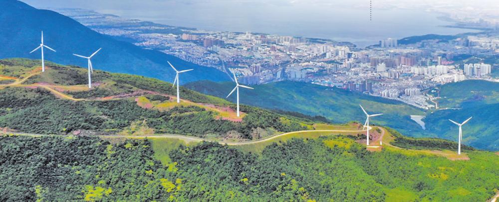大理者磨山上的风机迎风旋转,构成一幅壮美的生态画卷。 本报记者陈飞/摄