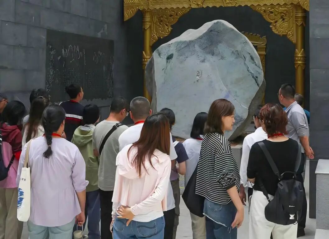 博物馆中庭处,有一块巨大的翡翠毛石——这是经世界纪录协会认证的世界最大糯种春带彩翡翠毛石,重达24.75吨,青底粉花交织,宛如凝固的云雾,堪称镇馆之宝。