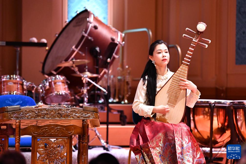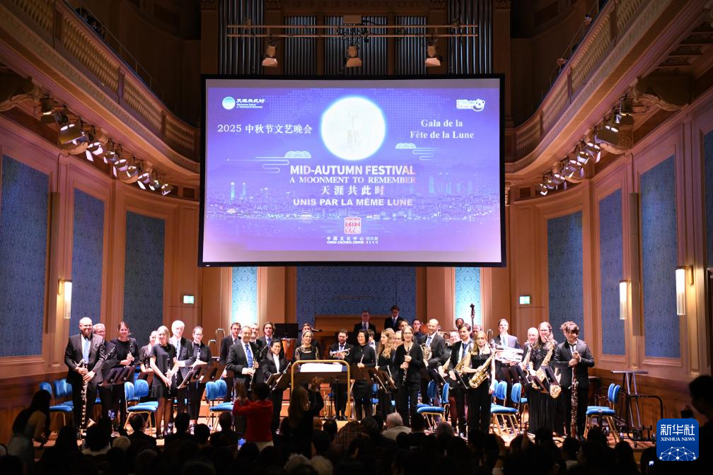 由瑞士伯尔尼中国文化中心主办的2025年“天涯共此时——中秋节”文艺晚会23日晚在日内瓦举行。来自杭州歌剧舞剧院“西子国乐”民乐团和瑞士日内瓦州立管乐团的音乐家们为现场观众献上了一场中西合璧的精彩演出,共同庆祝中华人民共和国成立76周年和中秋佳节。(新华网 新华社记者 连漪 摄)
