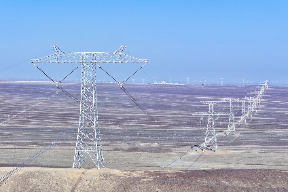 矗立在戈壁上的±800千伏哈密—重庆特高压直流输电线路工程(4月8日摄,无人机照片)。