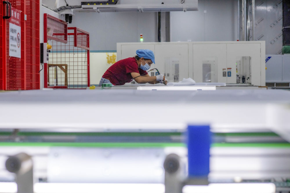 9月22日,工人在新疆巴音郭楞蒙古自治州若羌县的国晟企诚新能源有限公司对光伏电池片进行叠层返修。