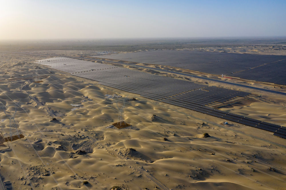 9月22日在新疆巴音郭楞蒙古自治州若羌县拍摄的中国绿发新疆中绿电若羌400万千瓦光伏项目(无人机照片)。该项目每年可发电69.08亿千瓦时,满足南疆200万户家庭用电需求,减排208.24万吨煤耗。