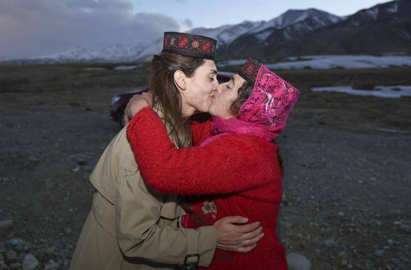 在新疆塔什库尔干塔吉克自治县瓦恰乡夏布孜喀拉村,一位长辈(右)和艾尔开牙·多力开告别(2024年3月22日摄)。