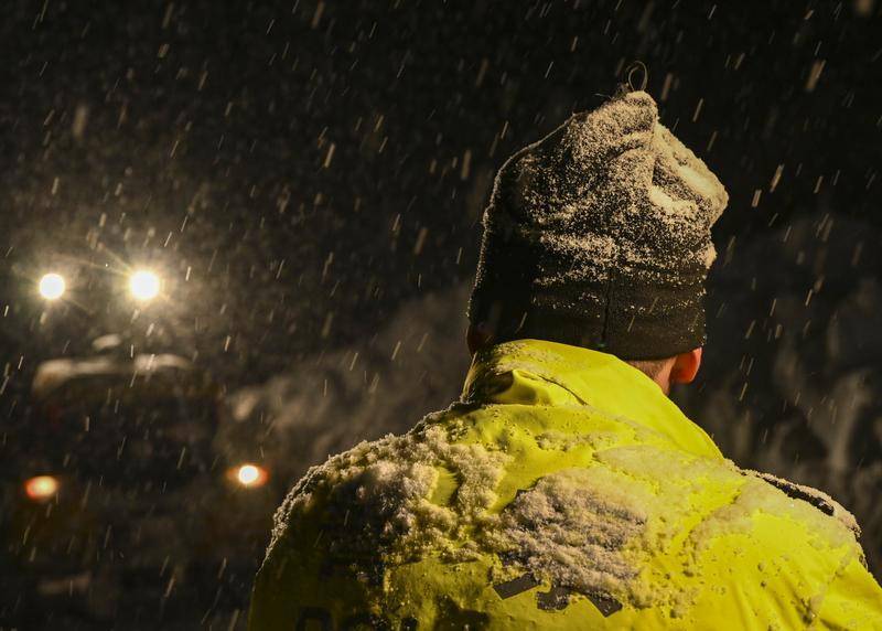 新疆喀纳斯景区公安局交警大队民警马国军在一处山路雪崩救援现场工作(2023年1月8日摄)。