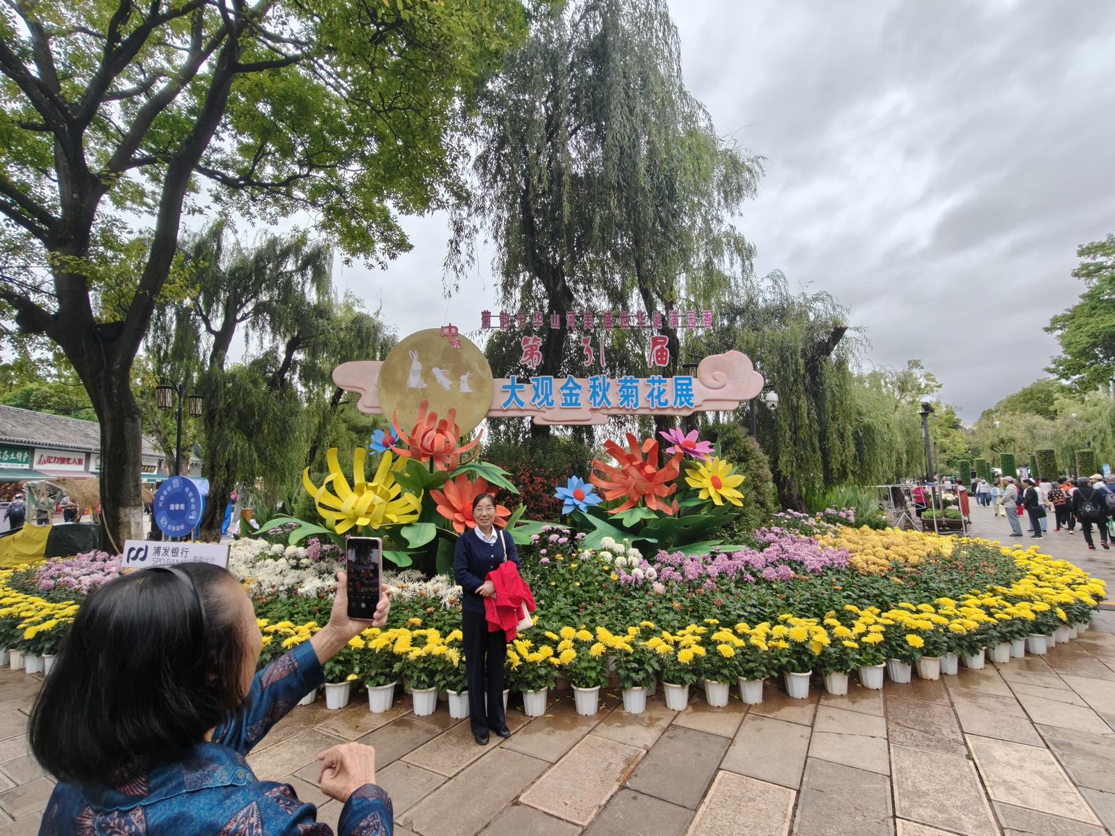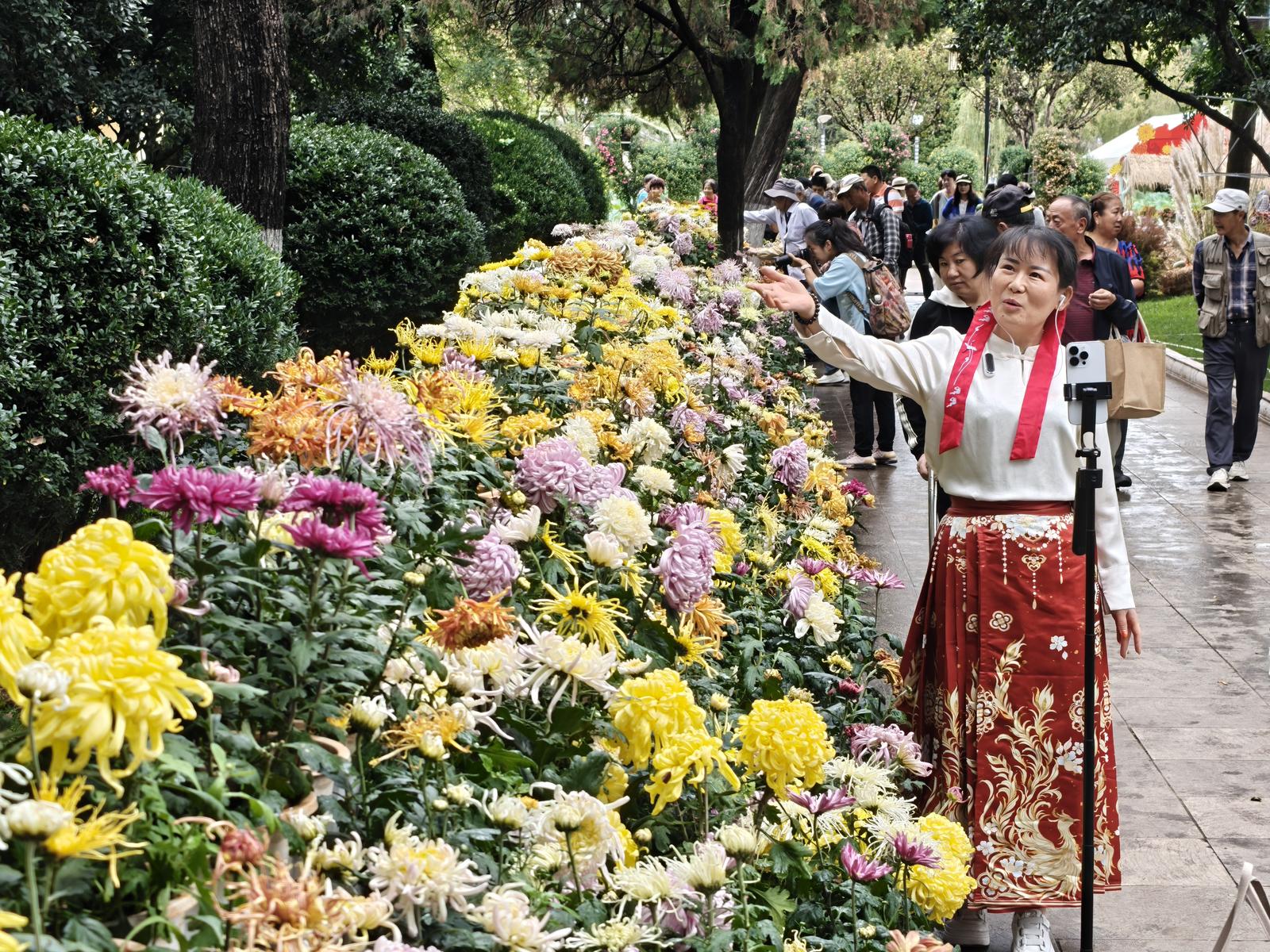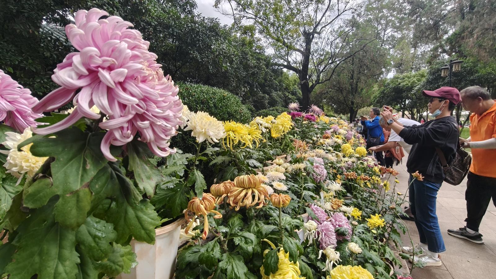 29日上午,记者来到昆明市大观公园,一进入公园,发现到处都是各种各样的菊花,有的初开,有的打蕾,给人一种花开盛世之美感。在近华浦,这里是菊花的集中展示区,近华浦主路临水一侧的草坪花架上陈列超过1.3米的悬崖菊,菊枝披垂、如瀑倾泻,形成一道绚丽夺目的菊花瀑布,极具视觉冲击力。在催耕馆内,集中展示12盆菊花盆景,创新融合菊花栽培与盆景艺术,涵盖大型树桩、丛林式、文人树及图案式等多种盆景类型,通过盆景技法对菊花进行整形修剪,探索菊花艺术表现新形式。近华浦门洞出口处则设置寓意祥瑞的菊艺小品,融合鲜艳色彩与喜庆元素,营造出浓厚的节庆氛围。